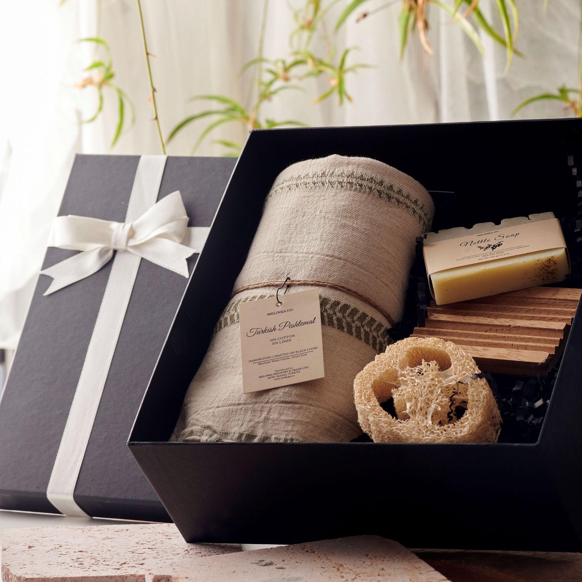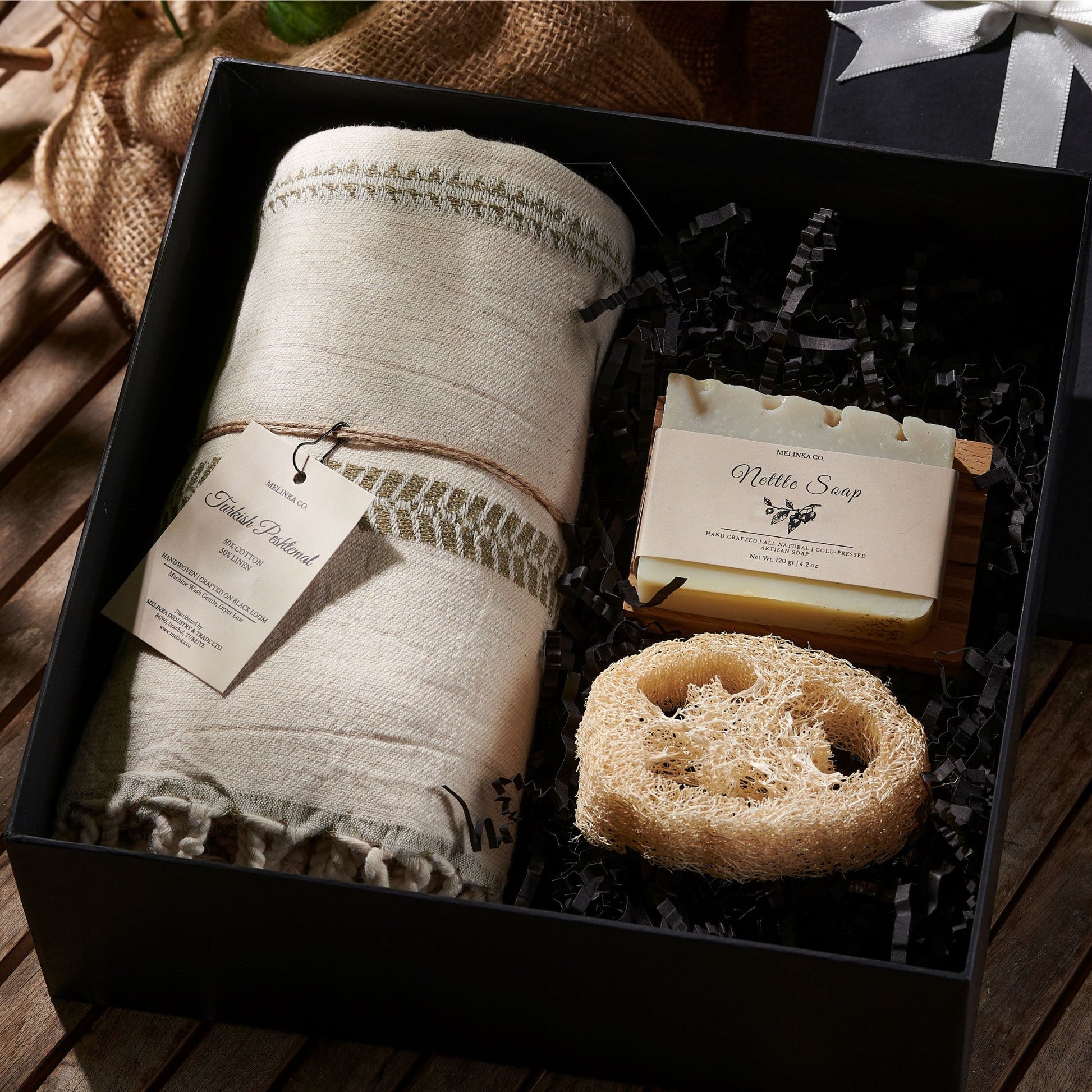 El dokuma Keten Peştemal, El Yapımı Doğal Sabun, İroko Ağacı Sabunluk, Kabak Lifi.